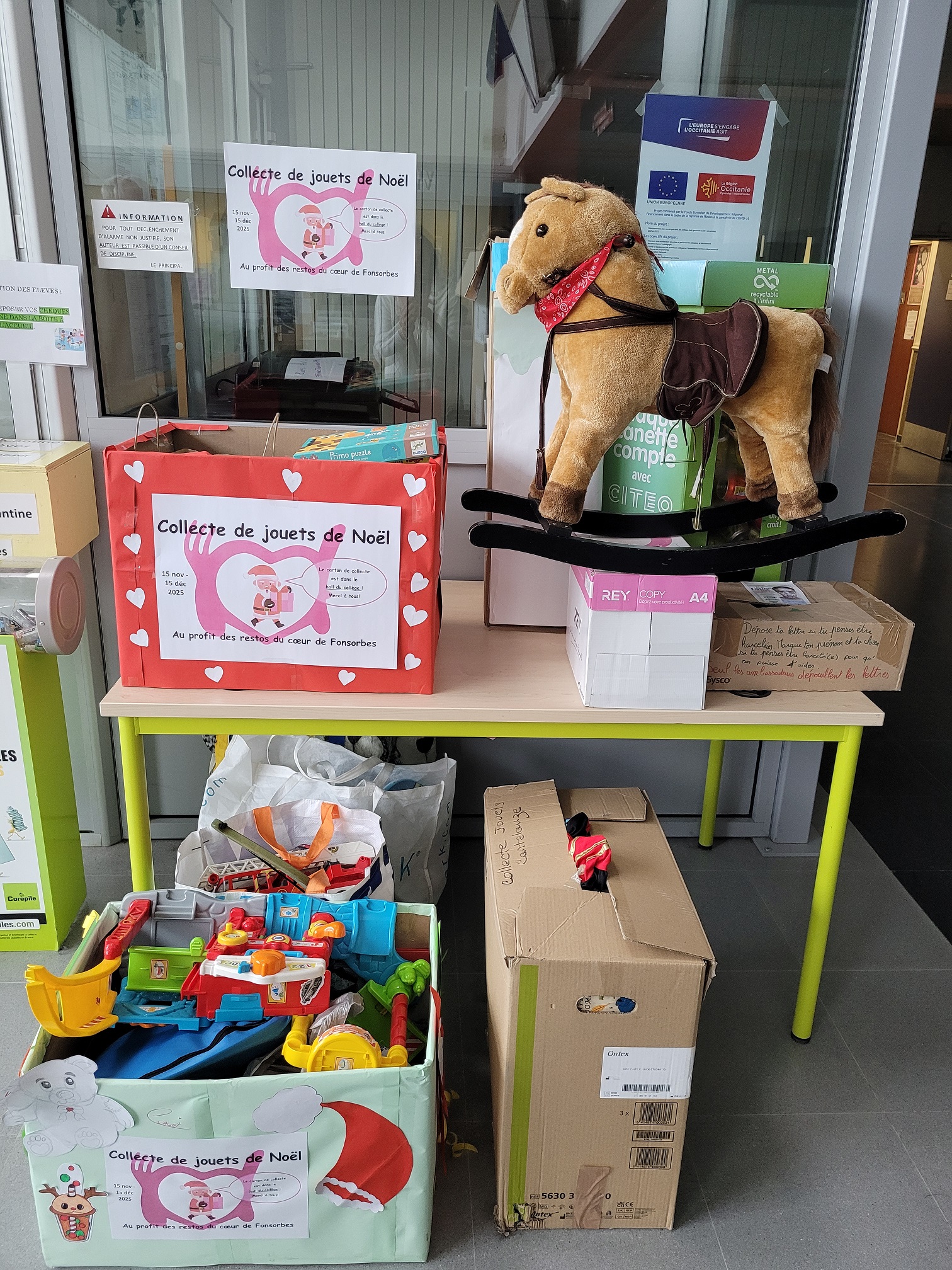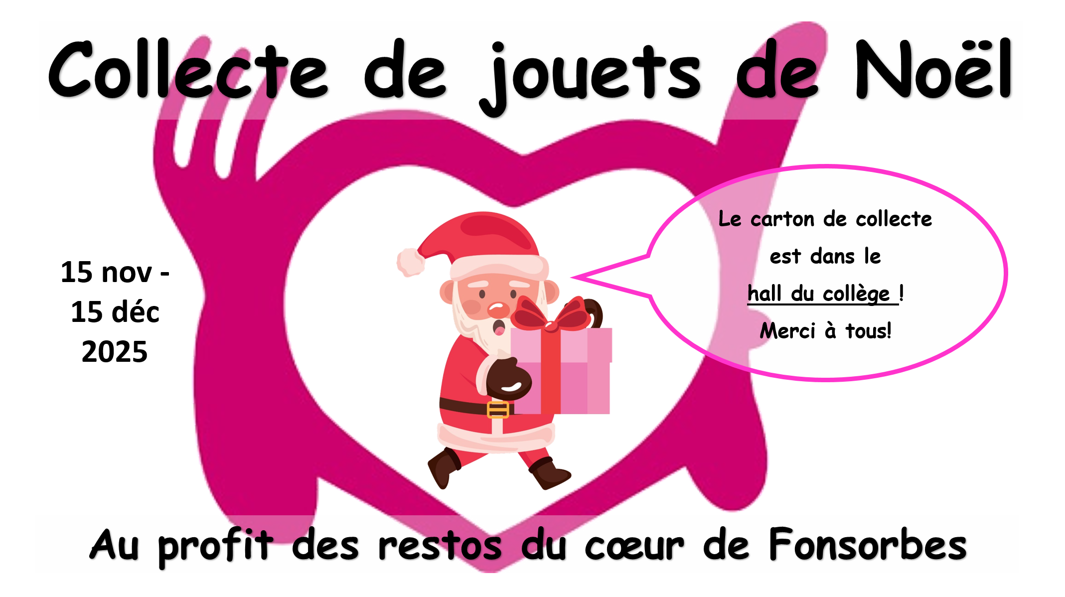 Chers familles, nous organisons une grande collecte de jouets et livres en bon état afin d'en faire don au restos du coeur de Fonsorbes. Merci à tous pour vos précieux dons qui feront des heureux à coup sûr !
