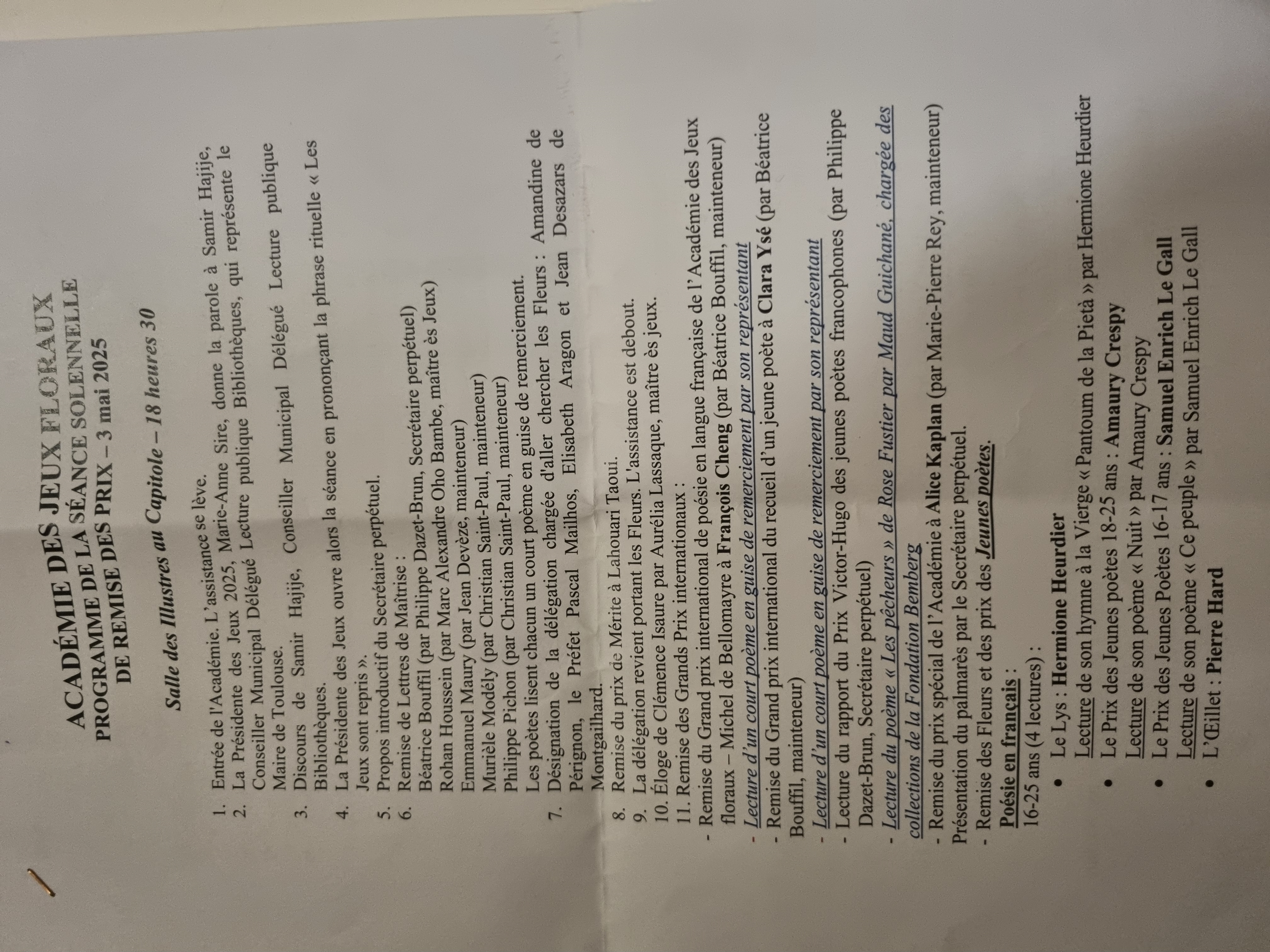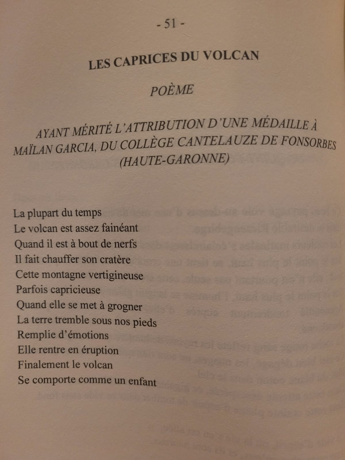 Félicitations à Maïlan, récompensée ce samedi 3 mai 2025 à la salle des Illustres du Capitole pour les qualités littéraires de son poème "Les Caprices du Volcan" au côté de poètes et écrivains reconnus!